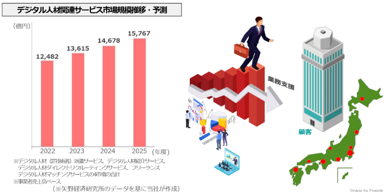 顧客ニーズが高く、拡大が続く市場を背景に高度IT人材等による支援サービスで事業を拡大している。豊富な実績で通信キャリアをはじめとした企業における開発領域の支援拡大を進めている。