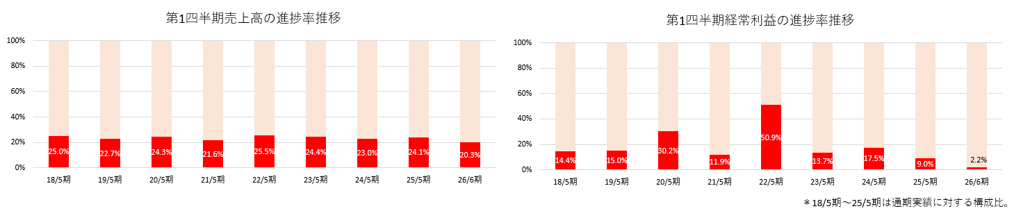 第1四半期の進捗率は売上高20.3%、経常利益2.2%で、26年5月期はどちらも例年に比べて低水準でのスタートとなったものの両事業とも増収。利益については、戦略的なプロモーション施策による広告宣伝費増加でクリエーション事業の利益率が下がった一方、ソリューション事業の利益率は改善している。