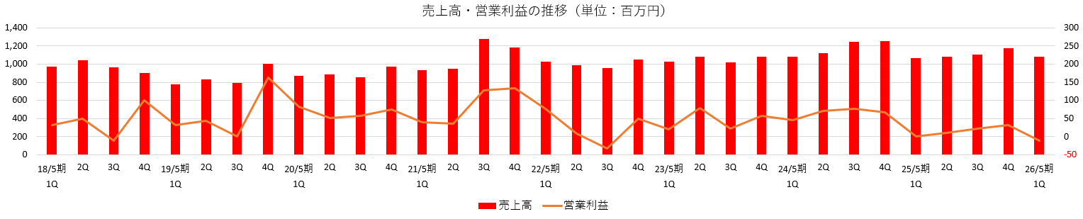 - 26年5月期第1四半期決算は増収、営業損失計上。売上高は前年同期比1.2%増の10億82百万円。クリエーション事業・ソリューション事業とも増収。営業損失は11百万円(前年同期は1百万円の利益)。システム開発サービスにおける外注費等の売上原価が増加し、売上総利益は同0.3%増にとどまった一方、月額コンテンツ会員獲得のための広告宣伝費投下に伴う販管費の増加(同3.7%増)を吸収できなかった。四半期ベースで22年5月期第3四半期以来の営業損失計上となった。