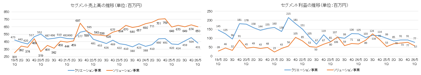 - 26年5月期第1四半期の進捗率は売上高20.3%、経常利益2.2%で、どちらも例年に比べて低水準でのスタートとなったものの両事業とも増収。利益については、戦略的なプロモーション施策による広告宣伝費増加でクリエーション事業の利益率が下がった一方、ソリューション事業の利益率は改善している。積極的な事業展開でクリエーション事業の増収トレンドを継続しつつ利益率を改善できるか、ソリューション事業の主力サービスであるシステム開発サービスを復調させられるか、中長期の成長と共に、短期的に第2四半期(中間期)以降の売上・利益の進捗も注視していきたい。