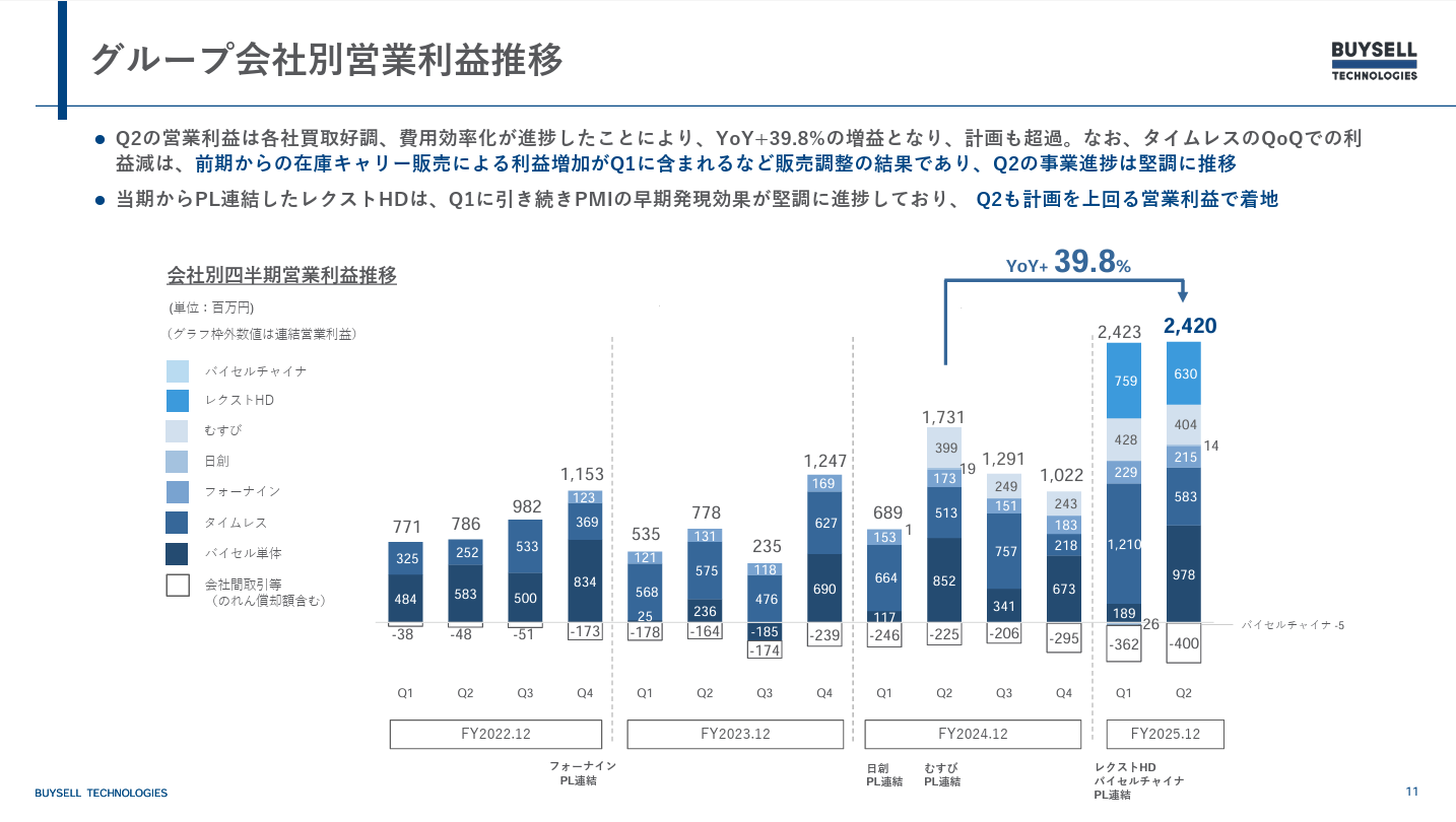 グループ会社別四半期営業利益でみると、バイセル単体およびタイムレスの営業利益が前4Q、今1Q、2Qでボラティリティが高くなっているように見えよう。これは在庫コントロールによって意図的に生じたものであり、総じて事業進捗は堅調だったとのこと。レクストホールディングスについては、PMIの早期発現効果が既に現れているとのこと。ロールアップM&AではPMI進捗が重要なKPIであり、ポジティブな印象である。