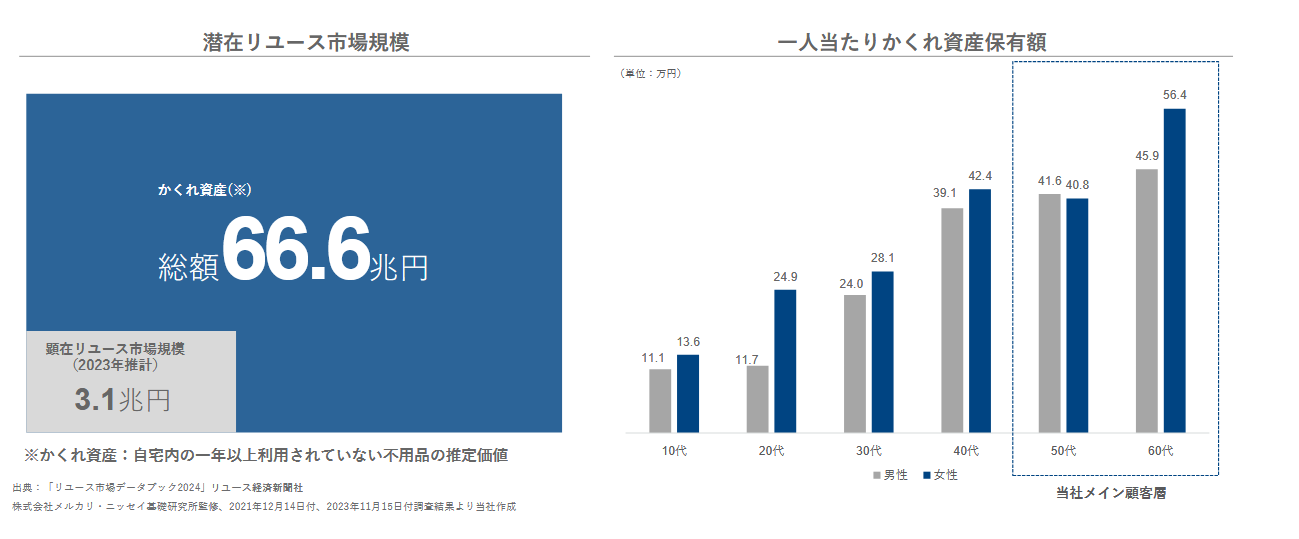 顕在化しているリユース市場の規模は3.1兆円(2023年推計)。隠れ資産が66.6兆円存在すると試算されており、潜在的拡大余地は依然として大きいと考えている。隠れ資産を多く保有しているのは年代で言えば50~60歳代であり、同社の主要顧客層と合致する。今後もこの世代からの買取拡大に注力していくことで、長期成長を持続させていくことになろう。