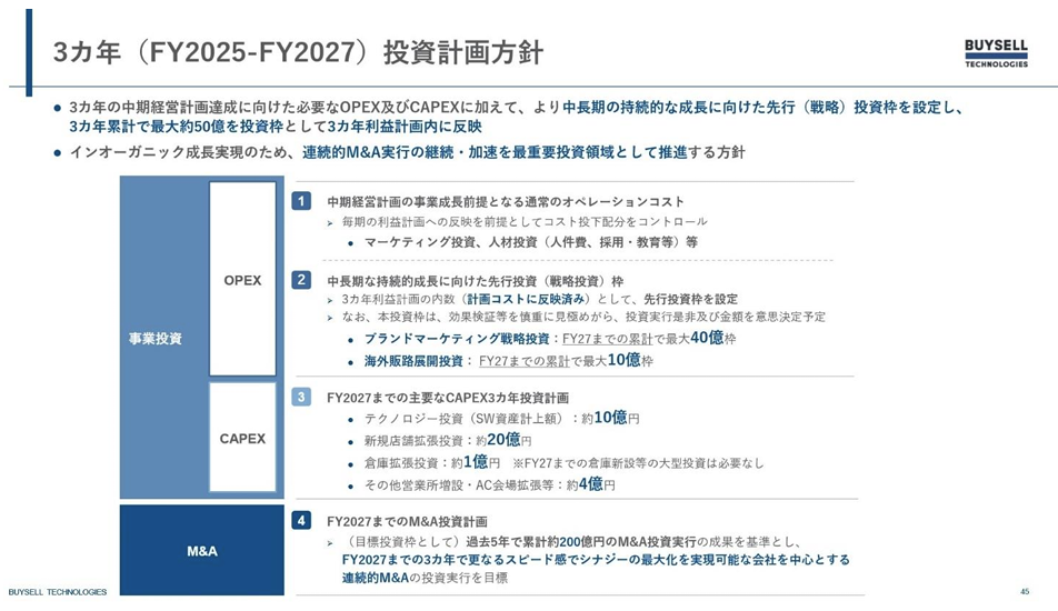 ロールアップM&Aについては、リユース事業へのM&Aを最優先としつつ、既存競争力の強化やリユース未着手領域の展開に寄与する投資も実行を継続していく方針。システマティックなM&Aを実現していくために、PMIのフレームワーク化にも取り組んでいく。投資規律としては、EV/EBITDA倍率の上限設定、J-GAAP前提で連結初年度から利益貢献(のれん負けしない)、PMIでのシナジーによる超過利益創出可能性、を掲げている。具体的な数値設定は開示されていないものの、過去実績に鑑みれば、高い投資効率が期待できよう。