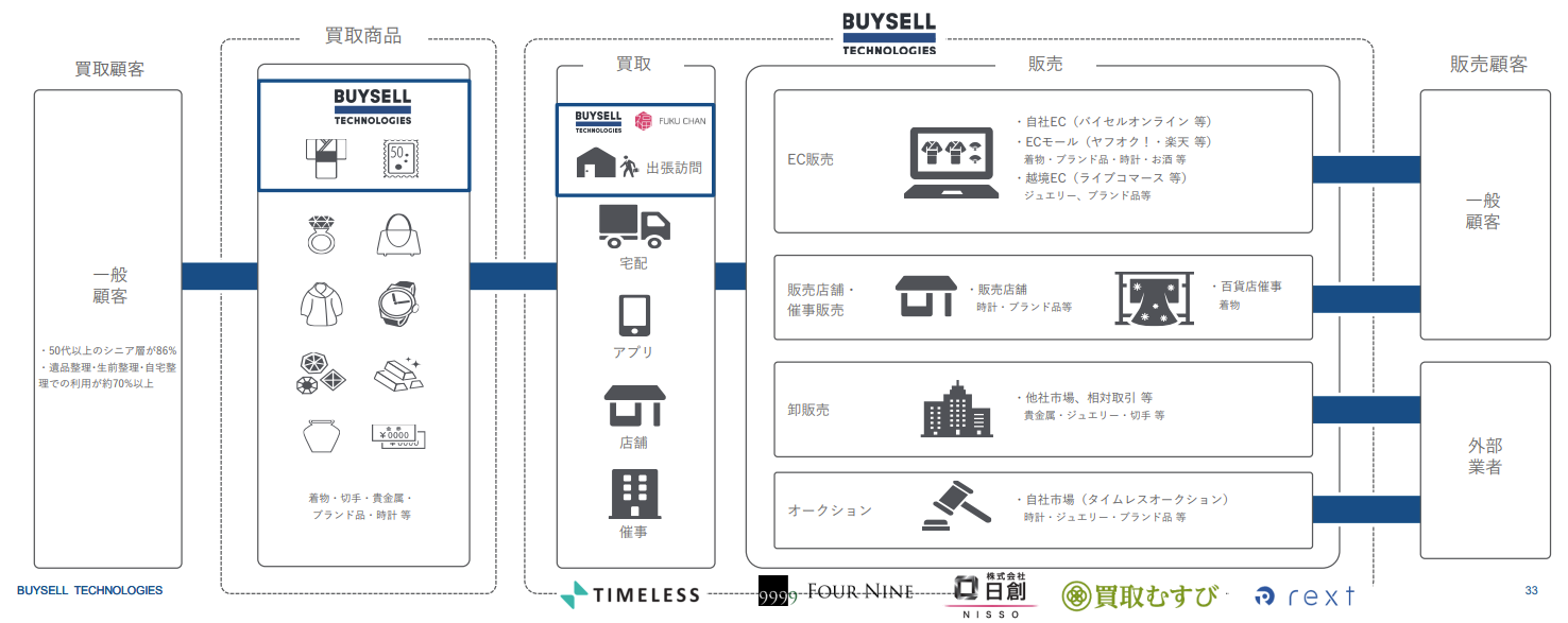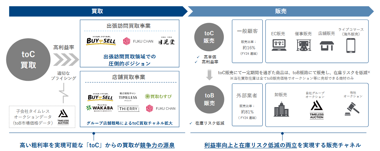 同社グループは買取・販売の循環を実現する総合リユースサービスを提供している。主要事業は出張訪問買取事業と店舗買取事業に大別される。これらのチャネルを通じ一般顧客から買取したリユース品を、グループ会社が運営するオークションや業者間取引によるtoB販路及び自社運営等のtoC販路で販売している。