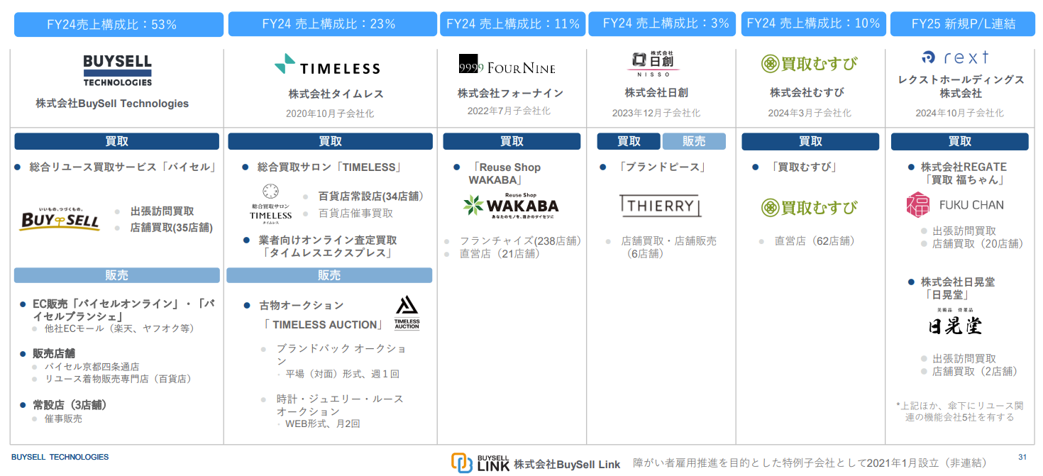 ロールアップM&Aによる非連続成長の実現に取り組む中、グループ企業も増大している。セグメントとしてはマルチチャネル型店舗、マス型店舗、百貨店常設型店舗、商材特化型店舗に区分される。今後も更なるロールアップM&Aに取り組んでいく中、それぞれの強みを活かしたマス・マーケット戦略・差別化戦略を推進し、グループ全体最適を実現しながら同事業における競争優位性の確立を目指していく計画。同時にマーケティング、店舗運営オペレーション、査定・真贋、イネーブルメント(育成)、店舗開発といった領域においてグループシナジーを創出していくことで、収益性向上、店舗数拡大の両立を図る。店舗数については27/12期末650店舗以上を目標にしている。
