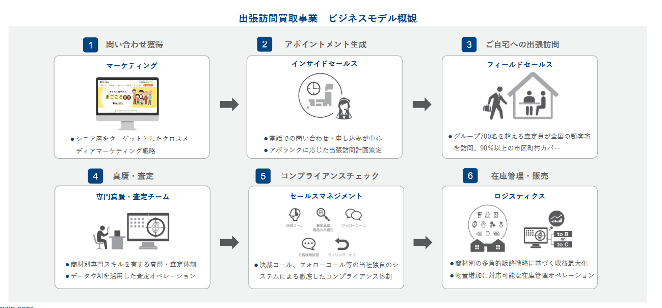インターネットやマスメディアを駆使したマーケティング戦略により買取希望者を集客するとともに、日本全国を対象に出張訪問買取を行う。多彩な買取/販売チャネルによるシナジーの最大化、シニア層を中心とした強固な顧客基盤、クオリティの高い経営陣などが特長・強み。巨大な潜在リユース市場の開拓と顧客基盤を活かした新規事業の創出により更なる成長を目指している。