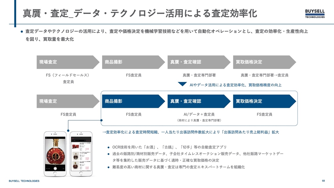 同社の査定体制は、正確な査定、贋物買取防止および査定員不正を防止する観点から、出張訪問する査定員の現場査定に加えて、査定員からモバイル端末を利用して送られて来る画像や動画等の情報をもとに、真贋及び鑑定を専門とする社員による二重チェック体制を採っている。査定データやテクノロジーを活用した機械学習技術などを用いたオペレーションの自動化による査定や価格決定の効率化・生産性向上にも取り組むことで、買取量の最大化を目指している。
