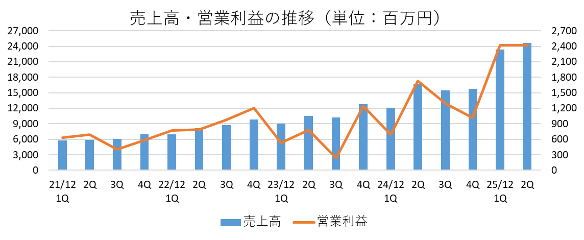 - 新中期経営計画初年度である25/12期会社計画は、2回の上方修正を経て、前期比66.7%増収、79.6%営業増益に引き上げられた。一株配当も従来計画の20円から前期比10円増配の25円とする計画に引き上げられた(25年1月1日付株式分割1:2考慮後)。中長期での成長実現に向けた投資はしっかりと行いつつも、収益力の向上が見込まれている点は素直に評価すべきだろう。