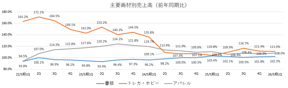 商材別には、ホビー・アニメ・トレカなどが大きく伸びているが、本やソフトメディアも確実に伸長している。