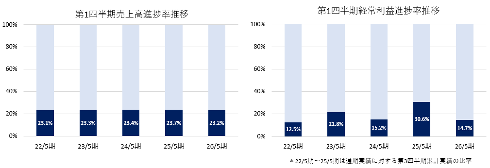 - 第1四半期の進捗率は、売上高23.2%、経常利益14.7%と、どちらも例年並み。ほぼ計画通りに進捗しているとのことだ。第2四半期以降、課題となっているプレミアムサービス事業の仕入回復、マレーシアにおける既存店売上改善がどの程度進むのか注目していきたい。