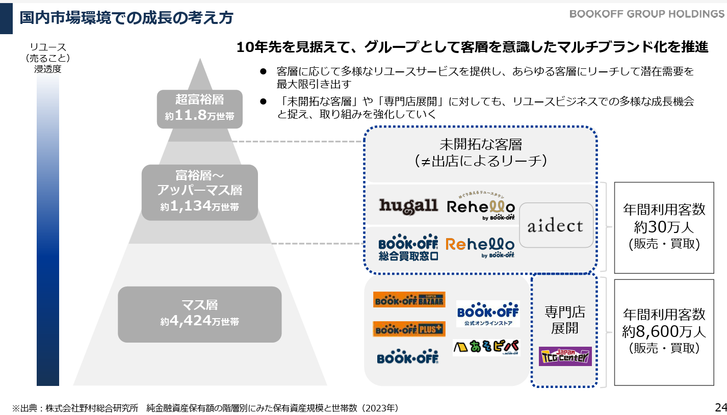 BOOKOFFだけではリーチしきれていない、資産性の高いモノを保有する顧客層に対し、多様なサービスブランドでリユース利用を増大させることを目指している。