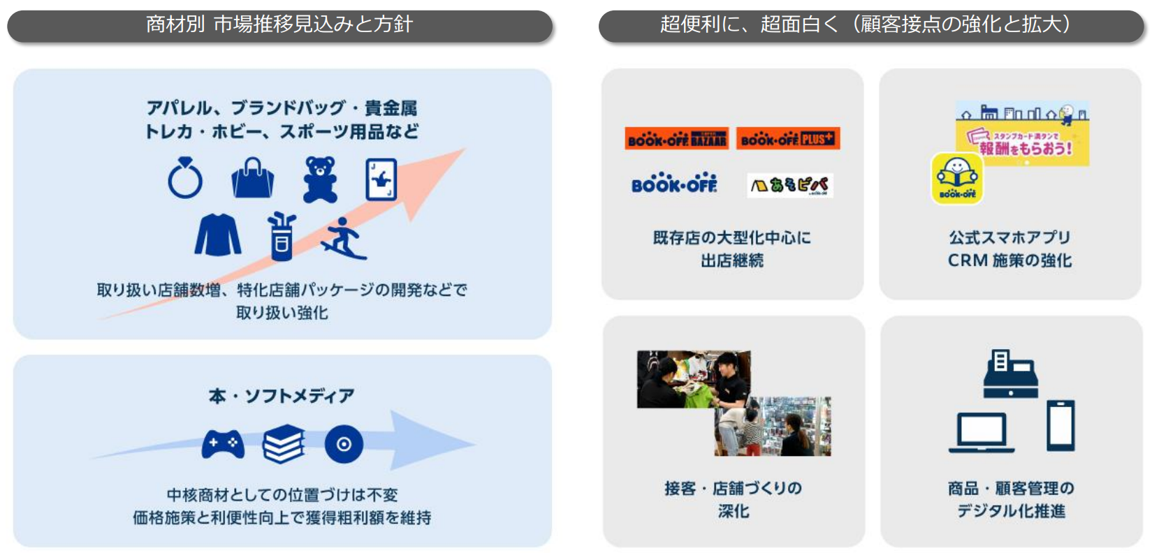 今後は、ブックオフ公式サイトや宅配買取サービスサイトなどをリニューアルするほか、会員アプリの機能拡充などを戦略的に実施し、顧客の利便性強化を図る。売上規模拡大に対応し、物流センターの倉庫オペレーションシステムの強化も必要と考えている。