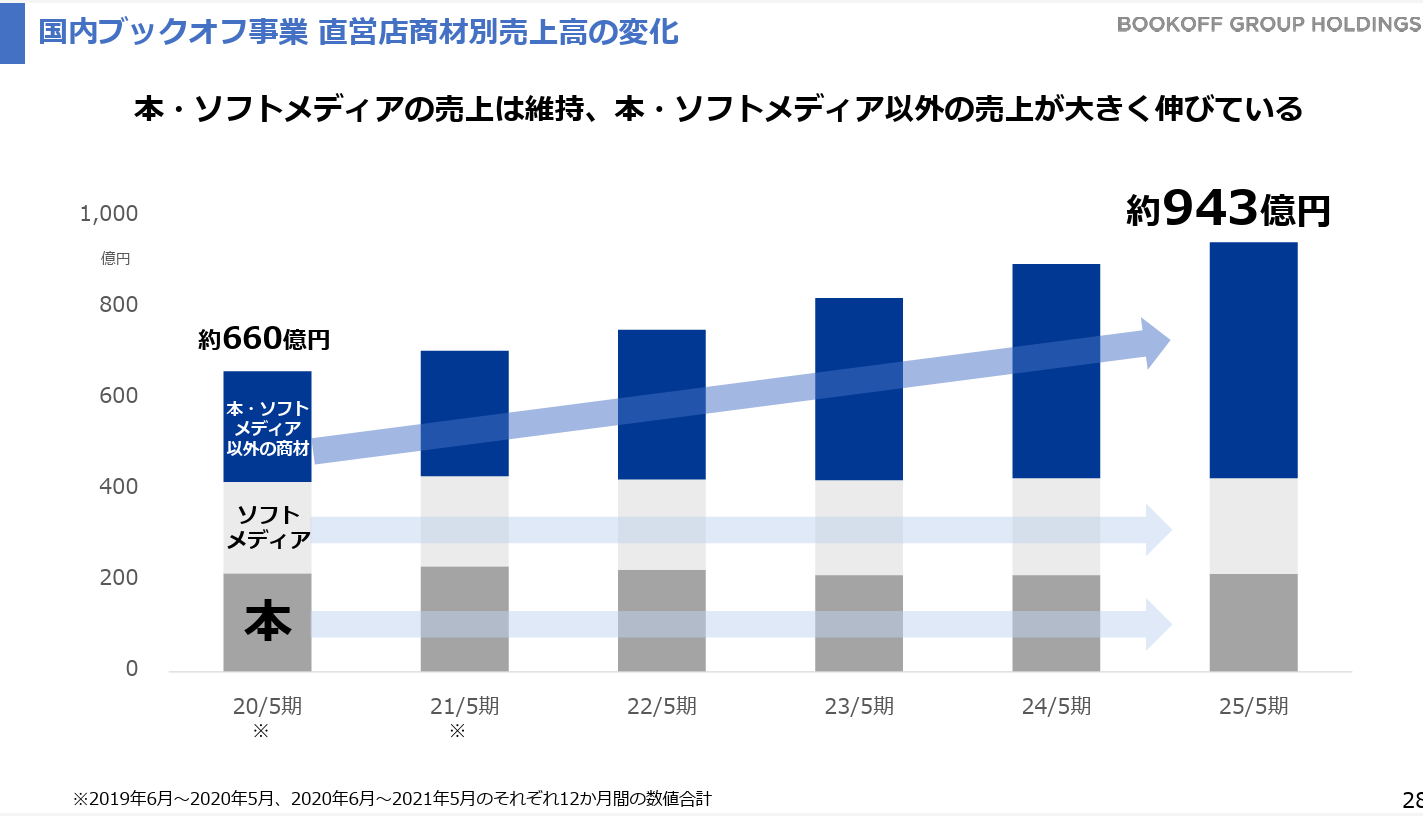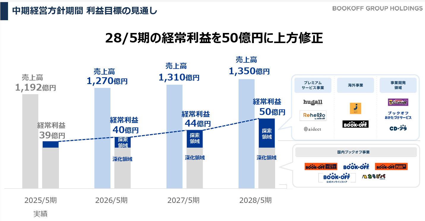 2028年5月期「売上高1,300億円、経常利益45億円以上」を目標としていたが、国内ブックオフ事業の堅調な業績推移を背景に、「売上高1,350億円、経常利益50億円」に上方修正した。