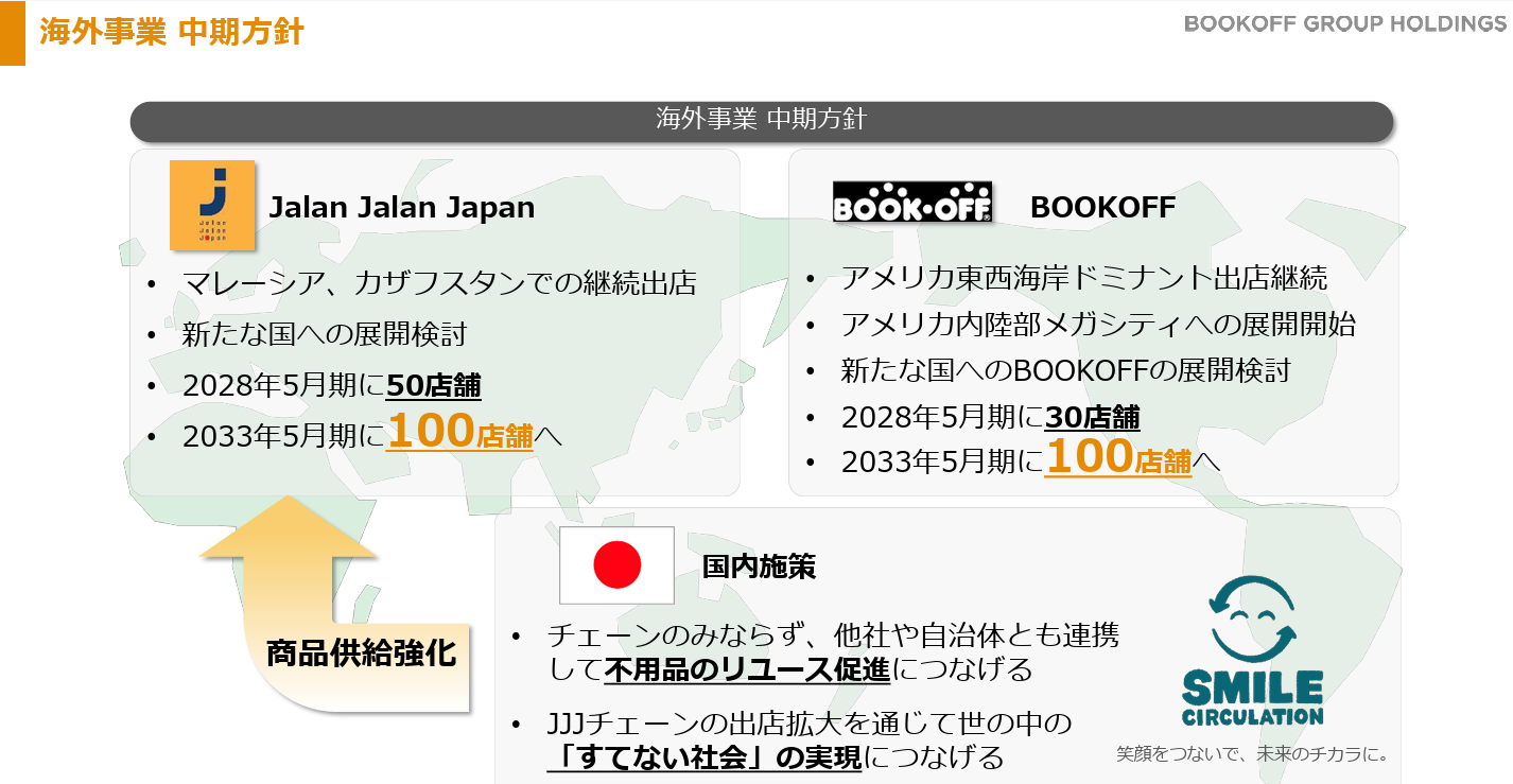 BOOKOFF U.S.A. INC.が米国で「BOOKOFF」店舗(直営店17店舗)を、BOK MARKETING SDN.BHD.が「Jalan Jalan Japan」をマレーシアで直営14店舗・加盟店2店舗の合計16店舗、J&K TRADING LLCがカザフスタンで直営4店舗・加盟店3店舗の合計7店舗をそれぞれ運営している。この他、フランスに加盟店3店舗を有している。