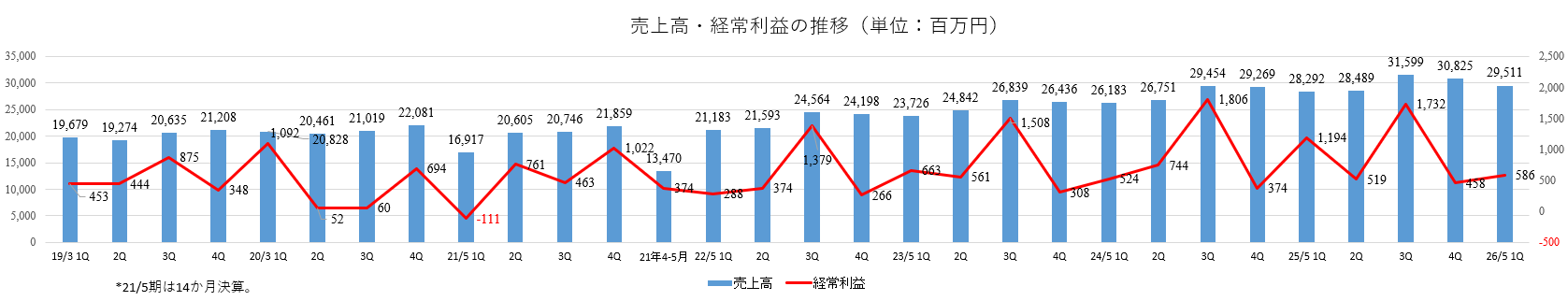 - 26年5月期第1四半期は増収減益。売上高は前年同期比4.3%増の295億11百万円。国内ブックオフ事業、海外事業は増収も、プレミアムサービス事業は減収。経常利益は同50.9%減の5億86百万円。増収も、好採算の書籍は堅調だったが、粗利率の低いトレカ・ホビーの伸長などで売上総利益は同3.7%増にとどまった一方、前期不正事案の調査対応等によりマーケティング活動や企業活動が一時的に抑制されていたが、今期は平常活動に戻ったことから費用が増加した。プレミアムサービス事業は損失計上。