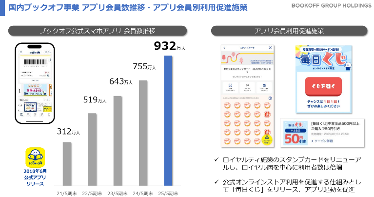 CRMを充実させるとともに、ロイヤリティプログラムの拡充を進めており、ブックオフにまつわる行動を会員アプリ内スタンプで可視化し、インセンティブを付与。顧客の生活に密着し、再来店・再購入を促す考えだ。