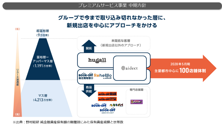 大手百貨店内で富裕層向け買取サービス等を行う「hugall」(18店舗)、本だけではなく、腕時計や貴金属、洋服、ブランド品、食器やスポーツ用品まで、何でも売ることができる買取特化型店舗「BOOKOFF総合買取窓口」(23店舗)、ジュエリーの買取・販売のほか、オーダー受注・リペア・リメイクなどジュエリーに関する総合サービスを行う「aidect(アイデクト)」(12店舗)を運営、合計店舗数は53店舗。店舗数は25年5月末時点。