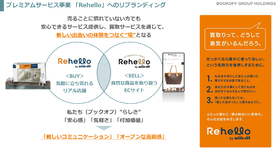 2023年1月、これまで「ハグオールファッション」の名称で展開していたECサイトの取り扱い商材や機能を大幅に拡充し、ブックオフグループのプレミアムラインを扱うサイト「Rehello(リハロ)」として、新たにオープンした。