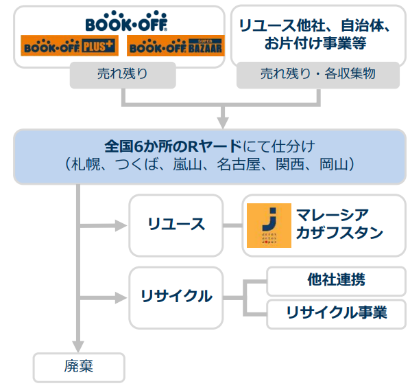 同社グループのチェーンのみならず、他社や自治体との連携、おかたづけ事業等を通じて収集した不用品は、全国6か所のRヤードでその状態によってリユース、リサイクル、廃棄に仕分けし、リユース品はマレーシア、カザフスタンに送付する。Rヤードに関しては関東圏中心にも増設も検討している。
