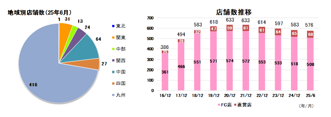 2025年6月現在、1都1府25県に576店舗(FC508店舗、直営68店舗)を出店。