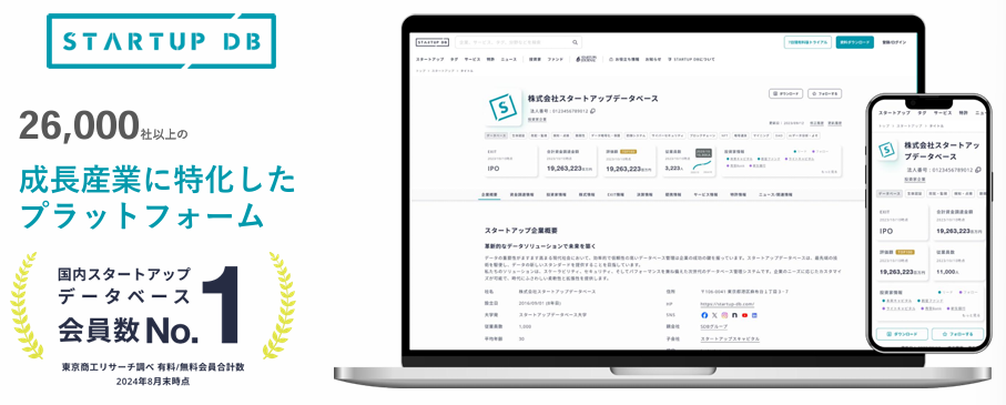 STARTUP DB | スタートアップ企業26,000社以上の情報を事業会社向けに提供。事業提携・出資のソーシングや 情報分析に活用されている。 | |