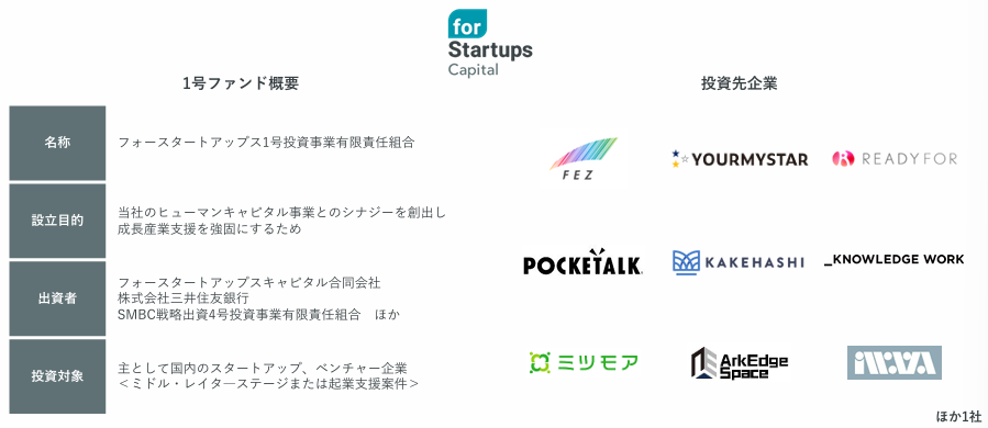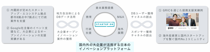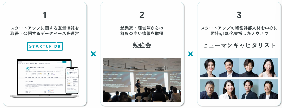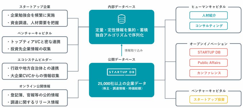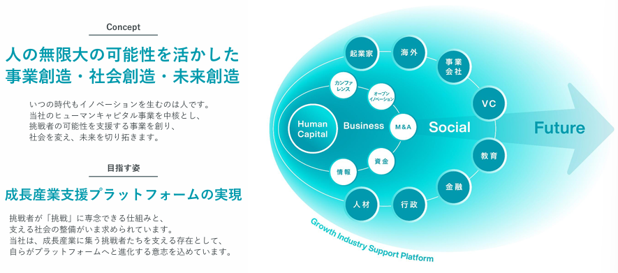 「成長産業支援事業」として「ヒューマンキャピタル」「オープンイノベーション」の2つのサービスを展開。人材支援に加え資金支援も実施することでハイブリッドキャピタル化を図り、スタートアップ企業の早期成長を促している。「イノベーションに関わるプレイヤーとのネットワーク」「国内最大級の成長産業データベース『STARTUP DB』」などが競争優位性。