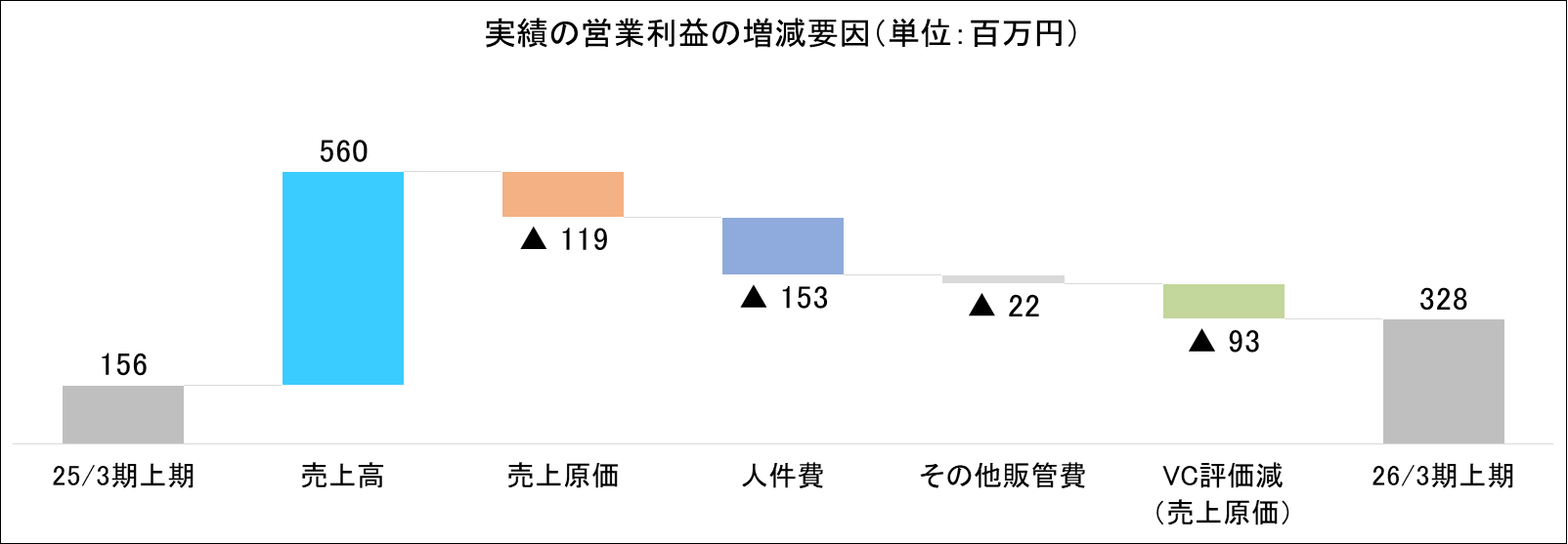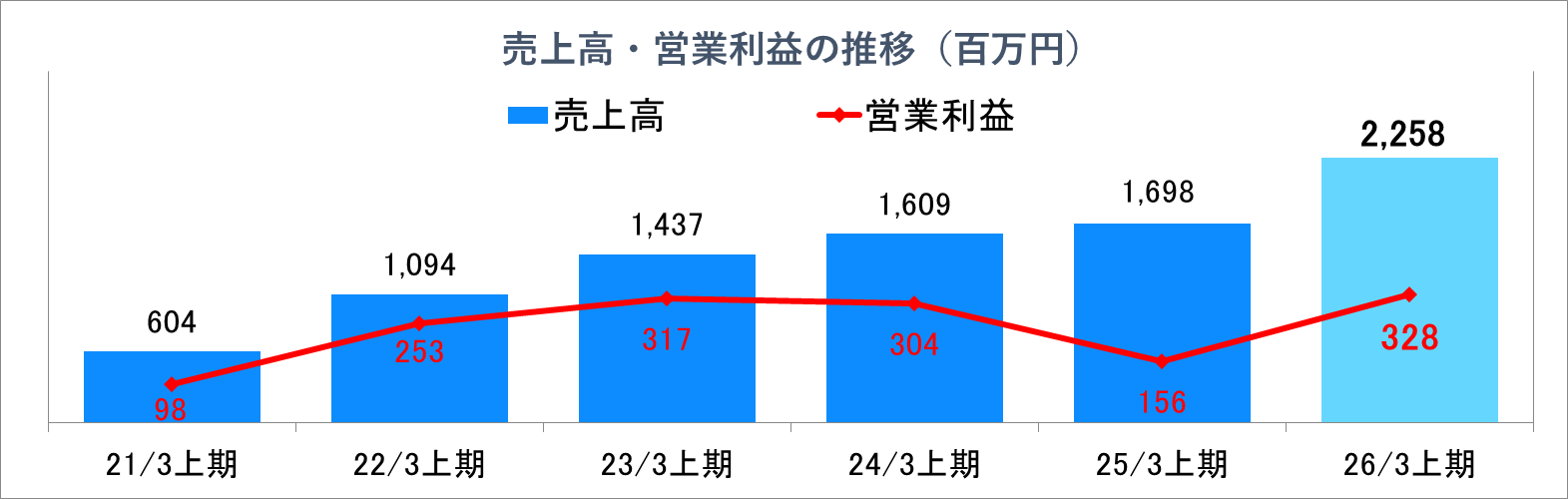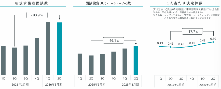 同社の26/3期上期決算は、前年同期比33.0%の増収、同110.3%の営業増益の素晴らしい決算となった。上期においてベンチャーキャピタル事業で、営業投資有価証券評価損として売上原価に93百万円を計上したにもかかわらず、営業利益が2倍以上に拡大したことは驚きであった。これは、人材紹介サービスにおいて、「質・量ともにNo.1のスタートアップHRの実現」を目指し、社員一人あたり決定件数(生産性)を向上するべく、より多くの求職者との接点拡大を重視した営業戦略の最適化が奏功し、成約件数の増加及び社員一人あたり決定件数の改善が進展したものである。ヒューマンキャピタル事業では、9月単月の売上高・受注高・KPI(面接設定UU数)のすべてが過去最高となった。KPIである求職者面談数の増加及びその後の面接設定UU数の増加を推進する中で、数多くの求職者と面談をするアウトプット数が増えることにより、新卒を含む新入社員の育成・立ち上がりの早期化が進展する好循環となっている。下期についてもヒューマンキャピタル事業におけるこれら主要KPIの動向が最も注目される。求職者を集客する指標としての「新規求職者面談数」、企業の面接選考に進む人数指標の「面接設定UU数」、更に、「1人当たり決定件数」をどこまで拡大できるのか期待を込めて注目したい。加えて、上期にヒューマンキャピタル事業では計画を上回る単価となった。今期は生産性向上の方針に伴い、求職者面談数の増加及びその後の面接設定UU数の増加を推進している反動により、面談する求職者の平均年収帯が下がることを想定していたものの、当上期は前期比で面談数が倍近くとなったものの、当上期の年収水準が前期とほぼ同水準となった。下期については、単価上昇が寄与した上期の状況は織り込まず保守的な単価を想定している。好調な単価が継続するのか、下期の単価の状況にも注目したい。