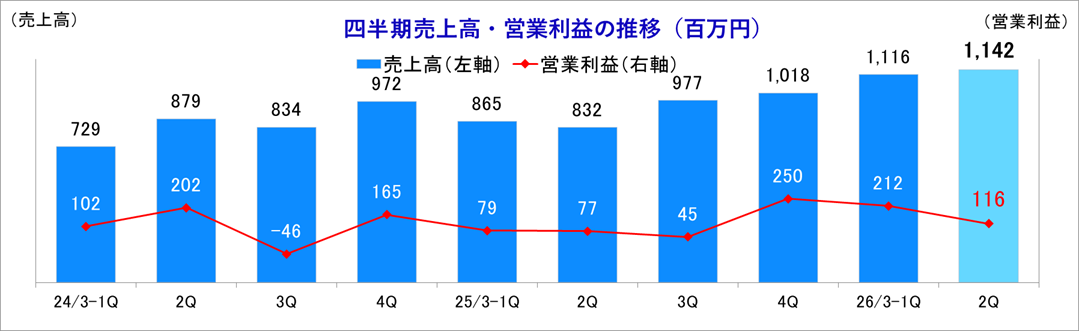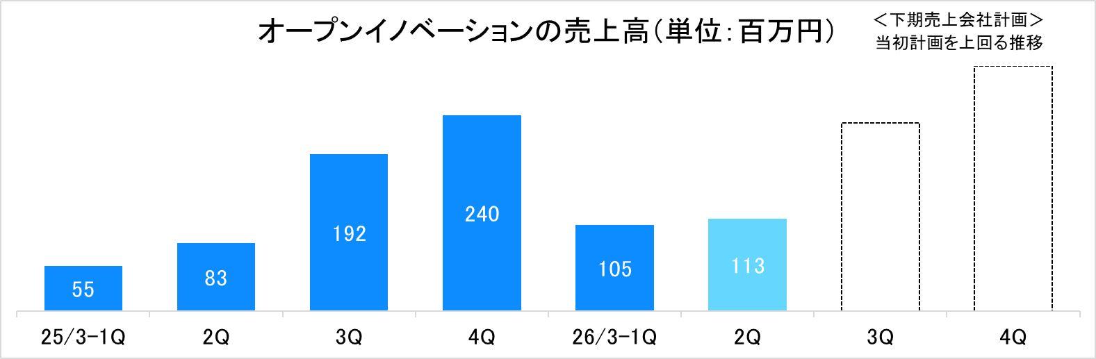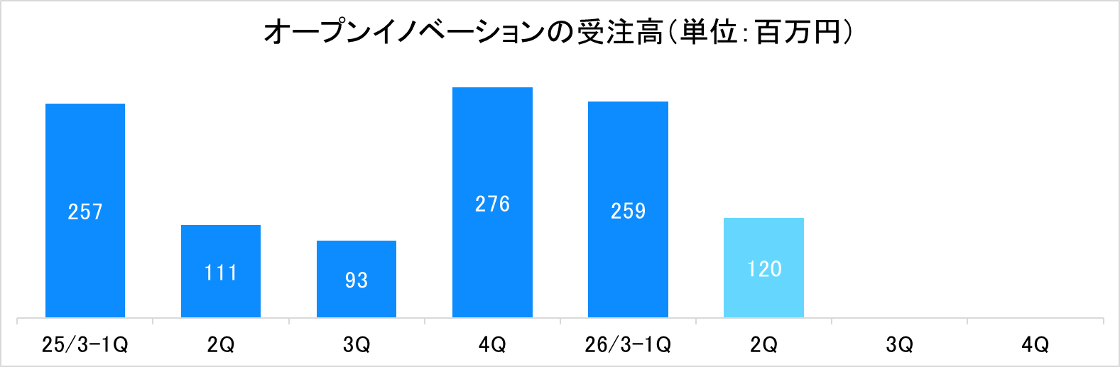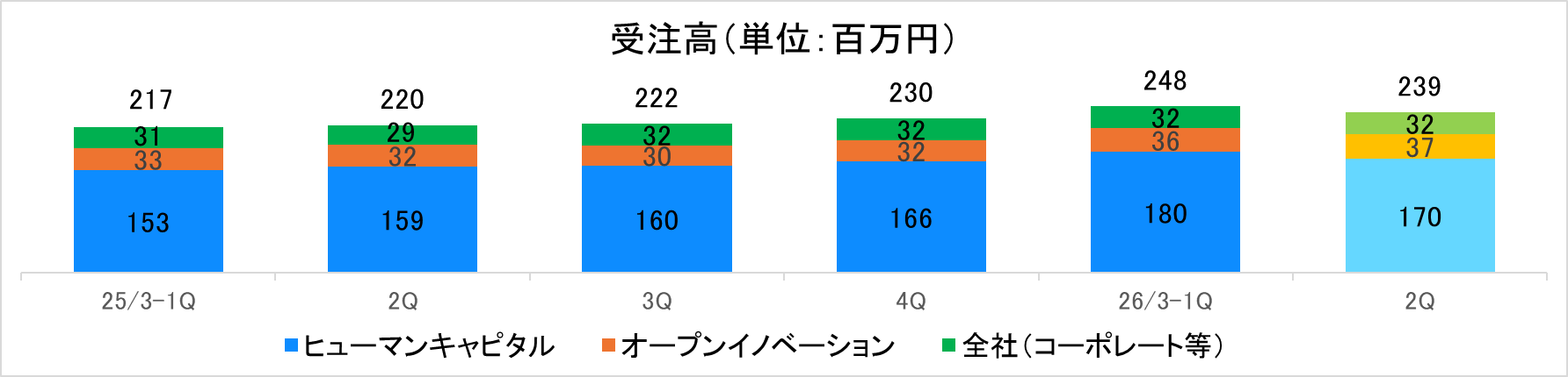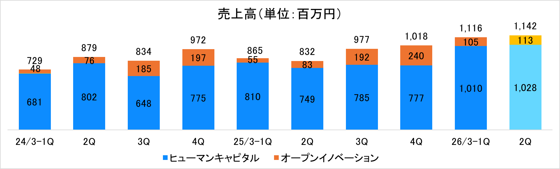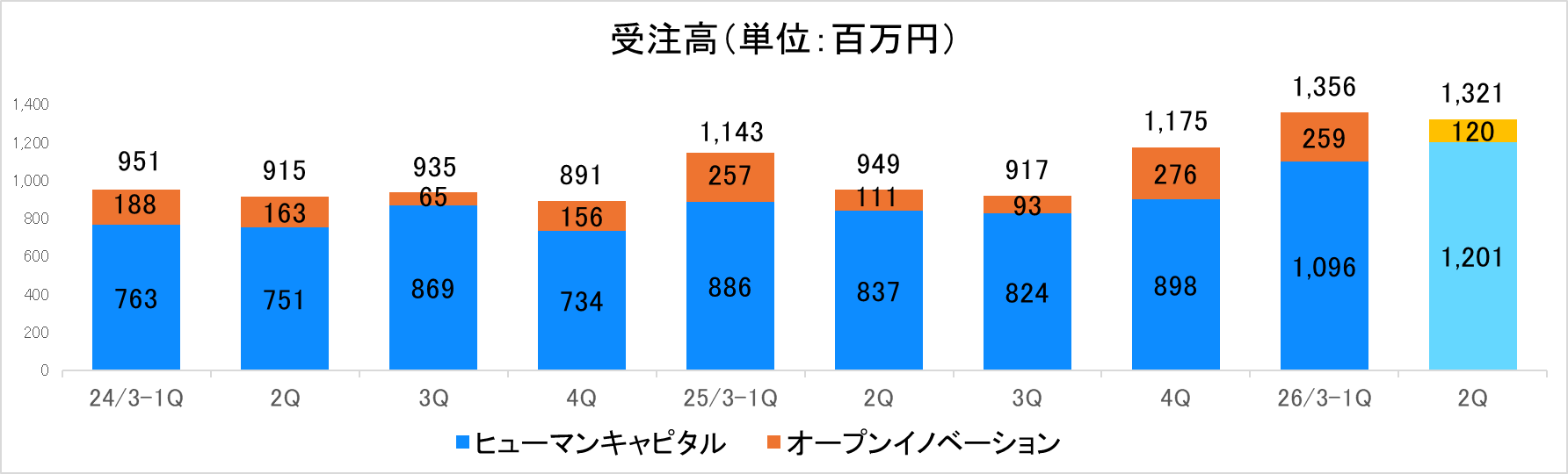 - 26/3期上期決算は前年同期比33.0%の増収、同110.3%の営業増益となった。主力のヒューマンキャピタル事業が大きく成長し、業績を牽引した。営業戦略最適化により上期の売上高・受注高がともに過去最高を記録した。オープンイノベーション事業は収益性が向上した。一方、ベンチャーキャピタル事業で、営業投資有価証券評価損として売上原価に93百万円を計上。含み益が出ている投資案件もあるものの、会計ルールに則り損失が先行。受注面でもヒューマンキャピタル事業の受注高が過去最高を更新した。受注件数の増加基調は変わらずに単価上昇が寄与した。また、オープンイノベーション事業は計画通り進捗した。
