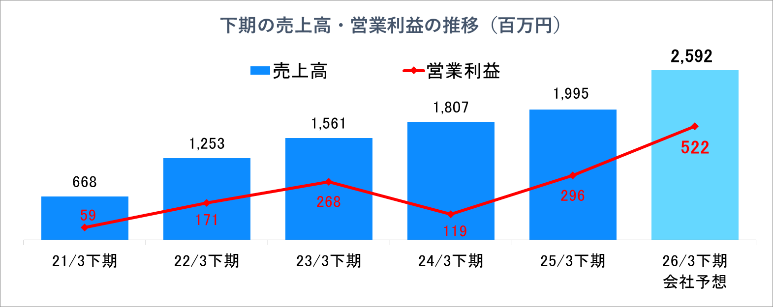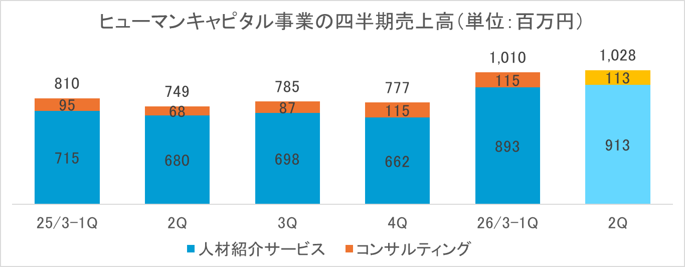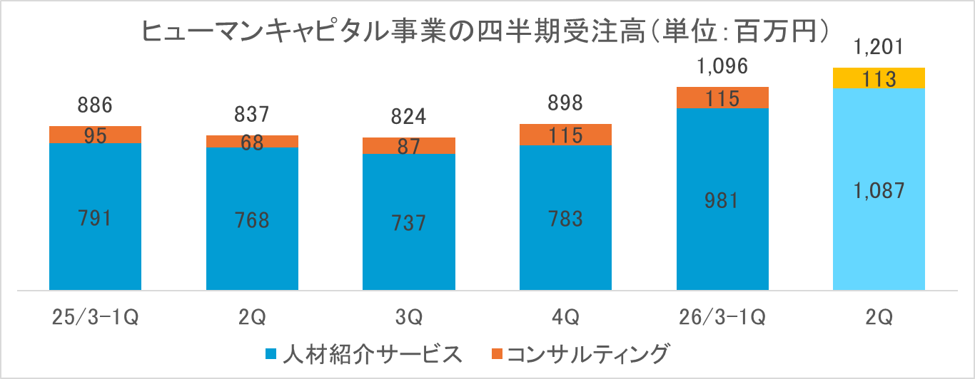 - 上期が終わり、当社は26/3期の会社計画の上方修正を行った。新しい26/3期の会社計画は前期比31.3%の増収、同87.7%の営業増益の予想。上期は、ヒューマンキャピタル事業において、求職者との接点拡大を重視した営業戦略への転換を図った結果、生産性指標として重視している一人当たり支援件数の改善が進み、支援件数が大幅に増加した。下期は、ヒューマンキャピタル事業の上期の受注状況及び業績を反映するも、単価上昇が大きく寄与している点を踏まえ当初受注計画の着実な達成を目指す。加えて、足もとの状況をさらに強固にするための人材採用を強化する。