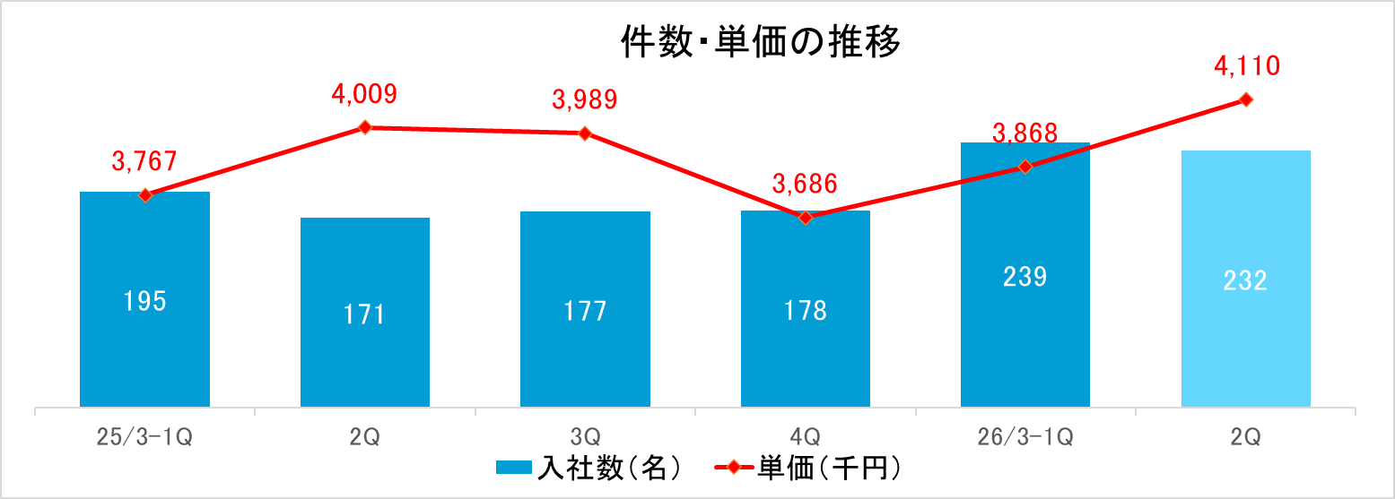- ヒューマンキャピタル事業における主要KPIが堅調に推移している。求職者を集客する指標としての「新規求職者面談数」、企業の面接選考に進む人数指標の「面接設定UU数」、「1人当たり決定件数」からなるKPIの拡大が同社の業績拡大を牽引している。加えて、入社数のベースを維持しながら、単価も過去最高を更新し、高年収帯の割合が増加している。下期においても、上期のKPIと単価が継続するのか注目される。特に、0.5まで向上した「1人当たり決定件数」を更に高めることができるのか注目したい。