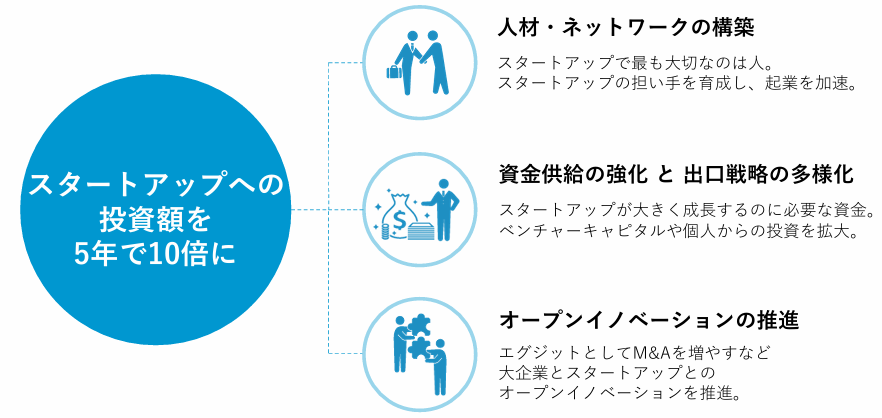 100社創出し、スタートアップを10万社創出することにより、日本がアジア最大のスタートアップハブとして世界有数のスタートアップの集積地になることを目指している。