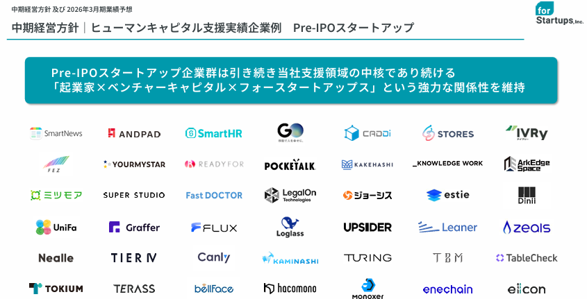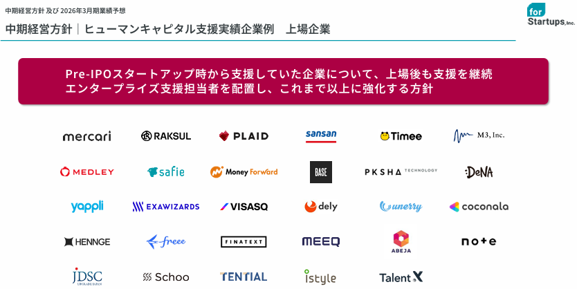 また、今期からスタートした中期経営計画では、「質・量ともにNo.1のスタートアップHR」の実現を中核とし、「成長産業支援プラットフォーム」への進化を積極的に推進している。「質・量ともにNo.1のスタートアップHR」では、AIを活用した業務フロー構築に向け子会社「アリカタ株式会社」を設立、タクシー内新番組「StartupsPrime」が放送開始するなどの進捗があり、今後はAI活用
