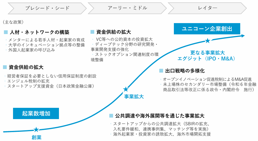 スタートアップの起業数増加、規模の拡大を大きな目標にして、ステージ毎の支援を展開する。