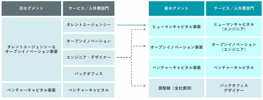 同社は、26年3月期より、ヒューマンキャピタル、オープンイノベーション、ベンチャーキャピタルの3事業へ報告セグメントを変更した。また、エンジニア人員及びエンジニア経費を従事する事業別に区分して表示している。