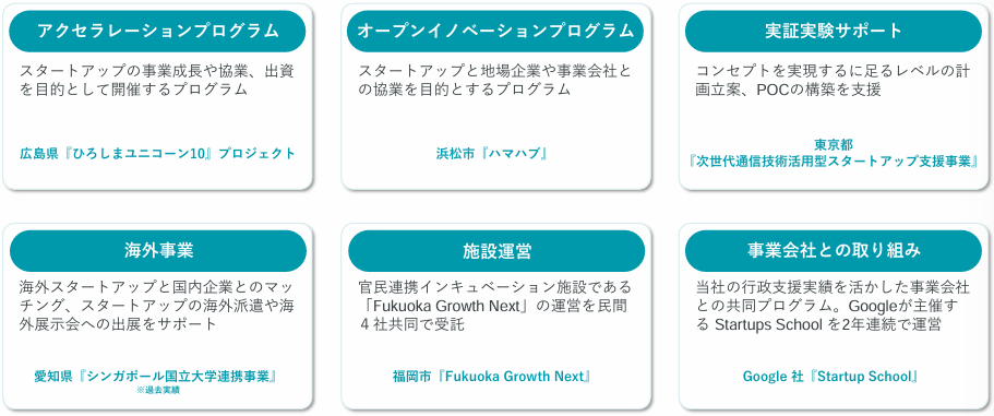 Public Affairs | 主に行政のスタートアップ関連事業を受託し、アクセラレーションプログラムやオープンイノベーションプログラムを運営・支援。 | |