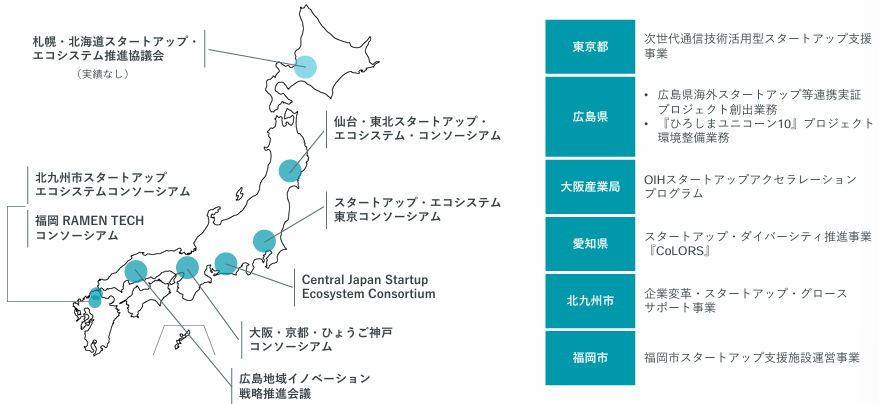 内閣府が定めるスタートアップ・エコシステム拠点都市のグローバル拠点都市8拠点中7拠点で事業支援実績をもつ。