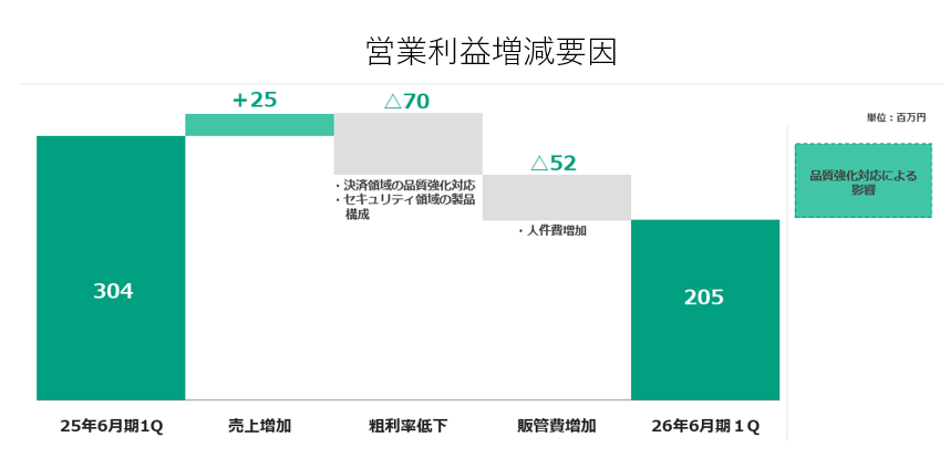 営業利益は同32.4%減の2億5百万円。利益面では、決済領域のクラウドサービスを提供する一部顧客への品質強化対応が発生した影響を受けて決済領域全体の粗利率が低下した。セキュリティ領域でも製品構成の影響により粗利率は低下した。売上総利益率は前年同期27.6%から24.9%に低下した。販管費は人件費の増加などにより7.8%増加し、営業利益率は前年同期8.6%から5.5%となった。