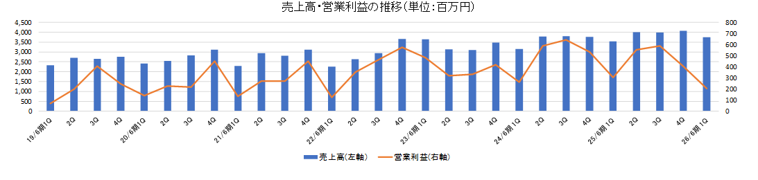 - 26/6期1Qの売上高は前年同期比5.7%増の37億46百万円。主力の決済領域は不正検知分野やクラウドサービスを中心に引き続き堅調に推移した。セキュリティ領域は大手顧客への製品導入等により増収。製品カテゴリ別ではクラウドサービスや自社サービスの金融機関向けインフラ運用サービスが大きく伸びた。ストック・フロー別ではフローが減収となったもののストック売上が大きく伸びている。営業利益は同32.4%減の2億5百万円。利益面では、決済領域のクラウドサービスを提供する一部顧客への品質強化対応が発生した影響を受けたことなどで売上総利益率は前年同期27.6%から24.9%に低下した。販管費は7.8%増加し、営業利益率が前年同期8.6%から5.5%となった。四半期ベースでは、1Q(7-9月)が低い水準からのスタートとなるのは例年通り。ただし、ここ3年でも営業利益は低い水準となっている。