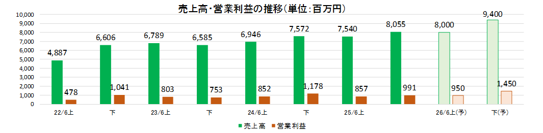 売上高 | 7,540 | 8,055 | 15,596 | 8,000 | 9,400 | 17,400 | +11.6% |