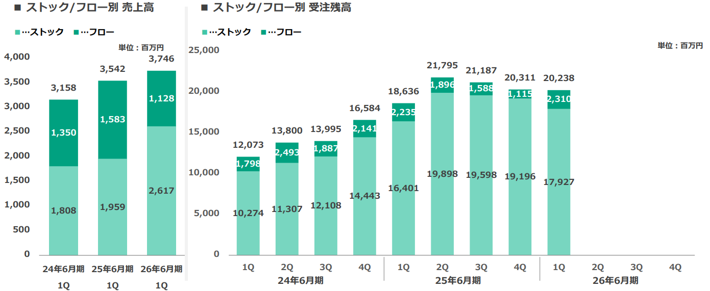 1Qは25/6期から続く一部案件で品質強化への対応があり、減益となった。しかしこれらの影響については期初から予想されていた。ただし、その対応が予定より遅れている模様。現在2Qに収束させるべく取り組んでいる。目先はその進捗を注視しながら2Qの状況を見ていきたい。こうした中にあっても、ここ数年で大幅に増加した受注残高は引き続き高水準を維持している。また、表にみるようにこれまでに大きく伸ばしてきたストック案件が今1Qに売上に反映されてきており、事業基盤が着実に拡大していることが分かる。今後は着実に2桁成長を持続させるだろう。また、引き続き中期経営計画で掲げる目標数値にも上乗せ余地があると見ている。