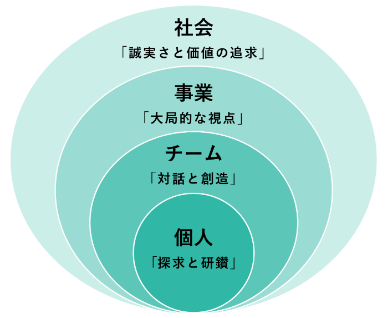 バリュー Value | IWI社員は、個人として「探究と研鑽」を通じて成長し、チームとして「対話と創造」により創発し、事業を「大局的な視点」で推進し、社会において「誠実さと価値を追求」していきます。 |
