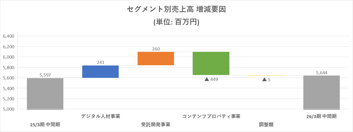 - 26/3期中間期は前年同期比0.8%増収、18.8%営業減益。デジタル人材事業では、非エンターテインメント市場において、受注が好調に推移した。受託開発事業では、引き続き受注活動が順調に進んだ。コンテンツプロパティ事業は、昨年9月にDragami Gamesにおいて発売した「LOLLIPOP CHAINSAW RePOP」販売の反動により減収となった。利益面では、デジタル人材事業と受託開発事業は増益だが、コンテンツプロパティ事業が減益。