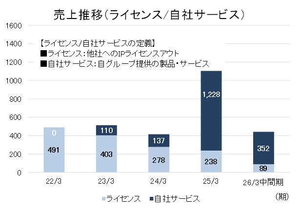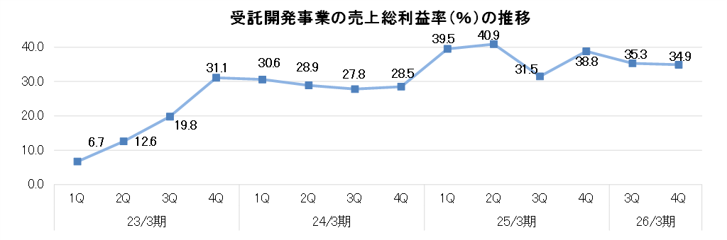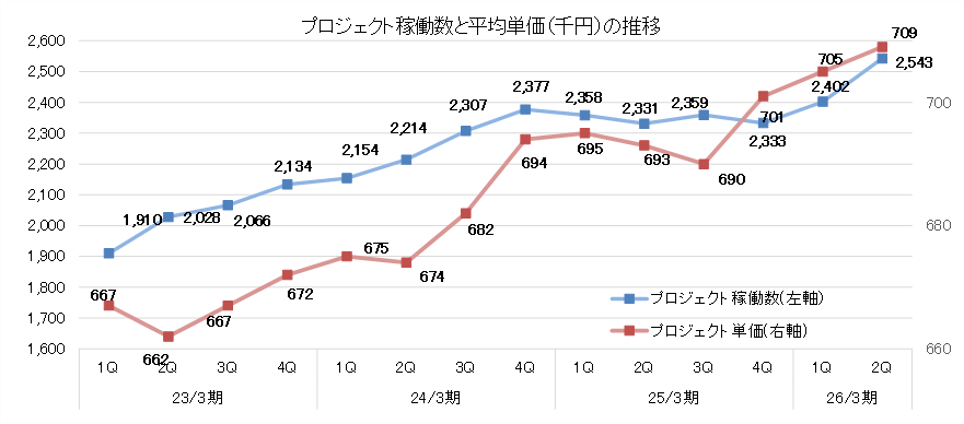 中間期は前期に発売した「LOLLIPOP CHAINSAW RePOP」の反動によるもの。見た目には良くないが、ゲームの展開を始めた同社にとってこうしたことがあり得ることはやむを得ない。その影に隠れているが、25/3期はやや苦戦も見られたデジタル人材事業がオフィスの拡大もあり、稼働数・単価を上昇させて軌道に乗ってきている。前期に効率化により利益を大きく改善させた受託開発事業においてはしっかりと2桁増収を確保している。前期の増収増益に寄与したドラガミゲームスは「LOLLIPOP CHAINSAW」のアニメ化が決定、新たなゲームの投入にも期待したい。