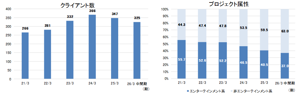 名古屋オフィスの拡大や大阪オフィスの立ち上がりの寄与もあり、稼働プロジェクトの属性は非エンターテインメント系の比率60%を超えるまでに上昇した。