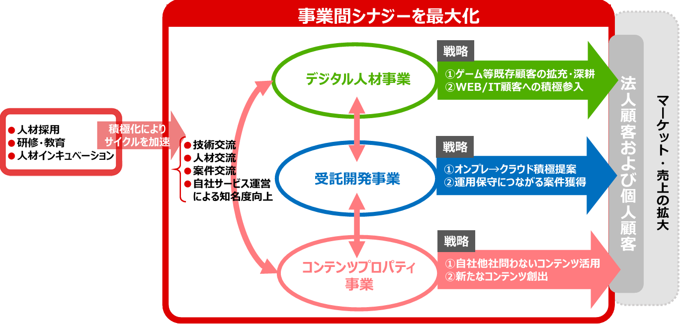 デジタルクリエイター&ITエンジニアプロダクションとしての機能を活かし、事業間シナジーを最大化、売上・利益の拡大・成長を目指す。