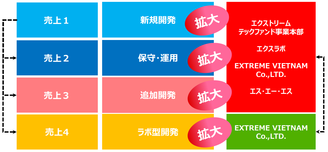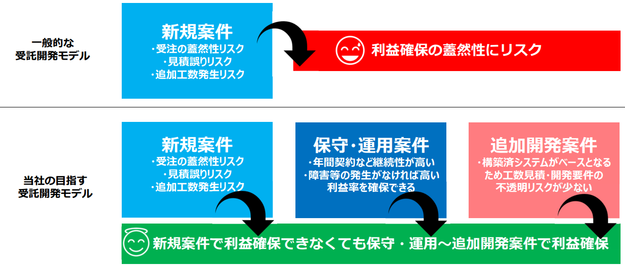 ・大規模プラットフォームをメインとしたソリューション提供は、運用型サービスがセットとなるケースが多く、新規受注〜保守・運用開発〜追加開発と安定的な受注が獲得できるサービスラインを構築する。