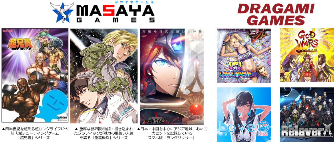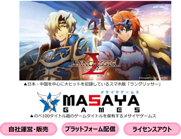 100タイトル超のゲームタイトルやキャラクターに関するIPを保有し、これらIPを利用したサービスが強み。「ラングリッサー」シリーズなどは30年を超えるロングセラーIPとなっており、長い期間に渡って収益を生み出すことが出来るIPを保有・活用できることは大きな強みとなる。同時に、新たなIPを生み出すべく、グループ会社のドラガミゲームスでは、自社においてゲームソフトの企画・開発・販売を行い、パブリッシャーとして自社サービスを展開している。