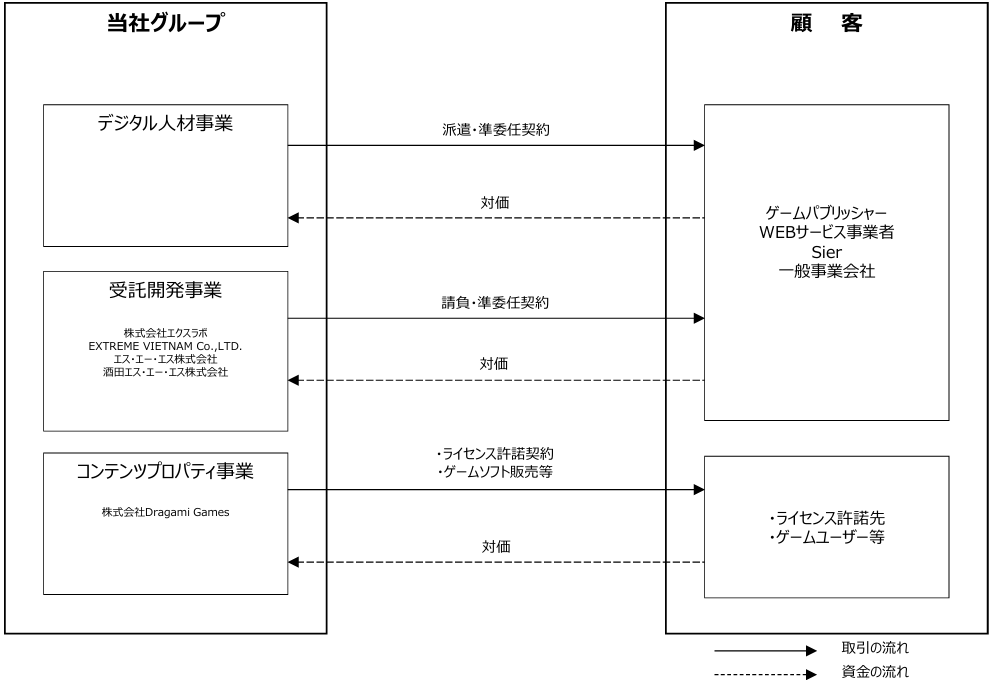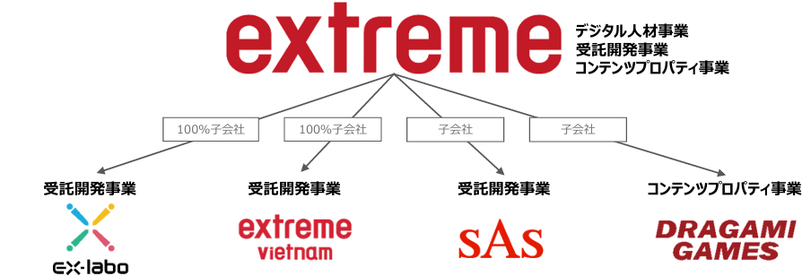 グループは、同社の他、連結子会社にオフショア開発拠点を活用したITサービスの開発等を行う(株)エクスラボ(出資比率100%)及びEXTREME VIETNAM Co.,LTD.(同100%、ベトナム国ハノイ市)。ゲーム開発・組込システム開発を行うエス・エー・エス(株)とその子会社である酒田エス・エー・エス(株)(同51.3%)。及び23/3期に新規連結し、(株)角川ゲームスから吸収分割により承継した(株)Dragami Games(同98.3%)。