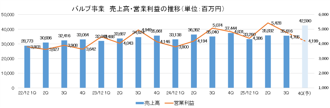 - 25/12期3Q累計の売上高は前年同期比2.8%増の1,308億16百万円。バルブ事業は同1.1%の増収。半導体装置向けの回復が予想より遅れている。しかし、価格改定効果や海外市場での販売量増加もあり増収となった。伸銅品事業は販売量が増加したこと等により、同10.4%の増収。営業利益は前年同期比9.4%増の118億65百万円。バルブ事業は特に海外市場での販売量の増加に伴う増収効果等により同11.7%の増益。伸銅品事業は、1Qでの計画的な炉の補修等による修繕費増加の影響が残り40.7%減益となった。営業外では保険収入が増加した反面、前年同期の為替差益が為替差損に転じたこともあり経常利益は同8.4%増の124億9百万円。前年同期に投資有価証券売却益を特別利益に計上した反動により、四半期純利益は同2.5%減の87億89百万円。