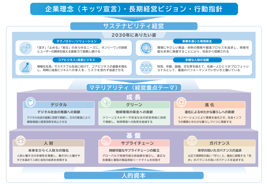 当社は、社会の持続的な発展と当社グループの中長期的な成長を両立させるために、サステナビリティ経営を重要な柱として位置付けています。特に、ESG(環境・社会・ガバナンス)に関わる課題への対応は、社会を構成する一員としての企業の責任を果たすとともに、当社グループの新たな企業価値を創出する機会であると認識し、2030年に向けた長期経営ビジョン『BeyondNewHeights2030 「流れ」を変える』において、サステナビリティ経営を経営戦略の中核に据えています。